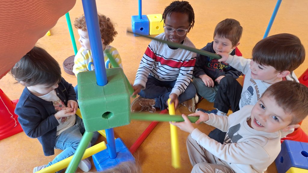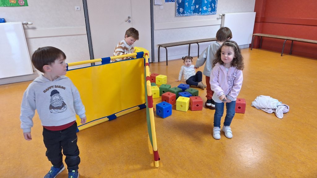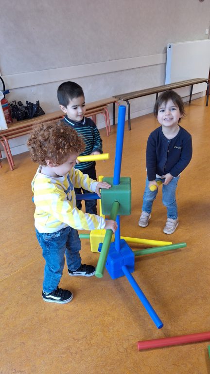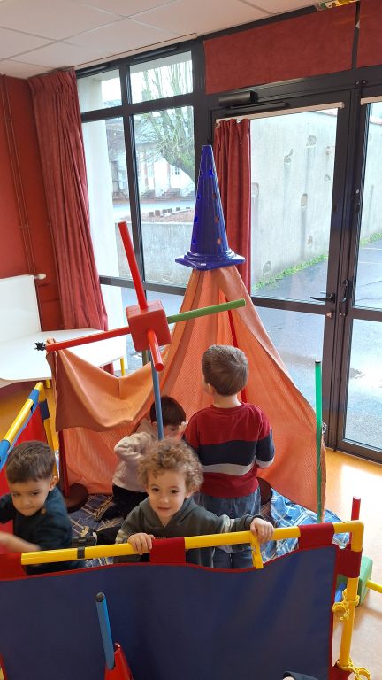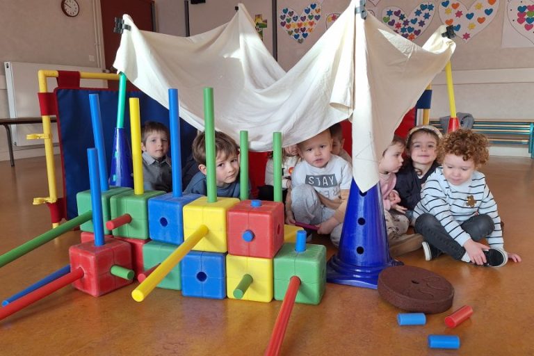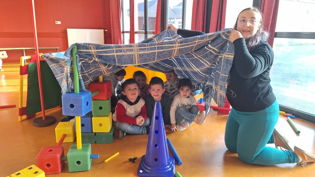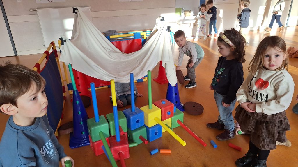 En motricité, pendant trois séances, la classe de TPS-PS s’est lancé dans la construction de cabanes. L’objectif était de coopérer en équipes pour choisir le matériel et construire une cabane. Les enfants ont rivalisé d’idées pour construire des cabanes, y ajouter des murs ou des tuyaux pour l’eau et même la cabine d’un bateau !
